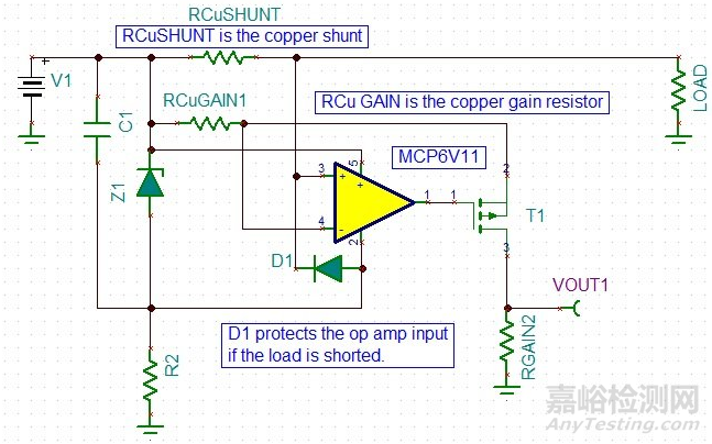 圖1:用于低側(cè)電流檢測(cè)的基本電路,采用了帶溫補(bǔ)的PCB銅跡線分流方案。本文圖片來(lái)源:微芯科技