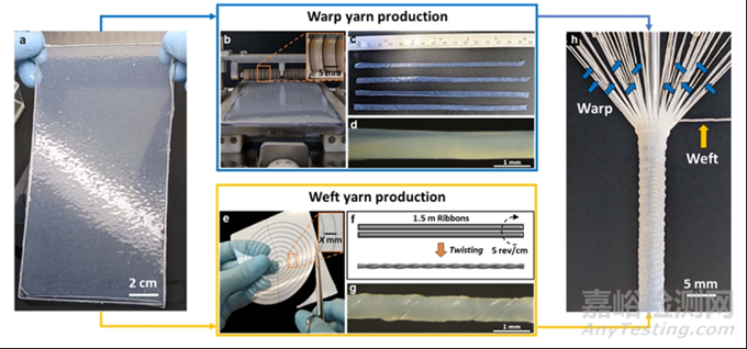 圖1簡(jiǎn)介TEVG生產(chǎn)所涉及的步驟。CAM片用于生產(chǎn)經(jīng)線和緯線。經(jīng)線由5毫米寬的CAM帶制成。緯線由兩條CAM帶擰在一起制成。使用兩條絲帶生產(chǎn)緯線,是為了讓緯線在血液透析過(guò)程中能更好抵御每周的反復(fù)穿刺過(guò)程。捻線的目的是產(chǎn)生有彈性的線。緯線在一組可移動(dòng)的經(jīng)線和一組固定的張力經(jīng)線之間反復(fù)滑動(dòng),以生產(chǎn)出壁質(zhì)均勻的人工血管移植物。修改后的編織參數(shù)作為TEVG編織過(guò)程中使用的經(jīng)紗支數(shù)(縱向絲帶的總數(shù))、緯紗絲帶寬度(用于生產(chǎn)緯紗的2條絲帶的寬度)和緯紗張力。