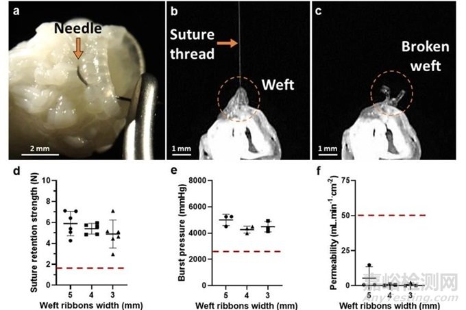 本文研究目的除降低血管的強(qiáng)度,使其更接近原生血管外,還有降低管壁厚度,使TEVG更靈活、更可用。假設(shè)這兩個(gè)目標(biāo)都可以通過(guò)減少緯紗中的材料量來(lái)實(shí)現(xiàn),因?yàn)楣懿牡闹芟驊?yīng)力是縱向應(yīng)力的兩倍,而緯紗支撐大部分應(yīng)力。因此,本文使用寬度較窄的緯帶編織TEVG。結(jié)果顯示使用兩條3毫米寬的緯帶捻在一起會(huì)使緯線的直徑明顯變小,進(jìn)而使TEVG的緯線密度明顯增加。此外,這還導(dǎo)致TEVG的壁更薄,使用μCT三維重建可以證明。但是使用較細(xì)緯線的一個(gè)缺點(diǎn)是,當(dāng)使用較細(xì)緯線時(shí),編織的TEVG內(nèi)徑略有增加。出現(xiàn)這種現(xiàn)象的原因可能是,在使用更細(xì)緯線織造時(shí),緯線的張力較小,織出的織物內(nèi)部張力較小,從織機(jī)芯軸上取下后收縮也不明顯。盡管使用的緯線所含材料減少40%,但TEVGs的植入相關(guān)特性并沒(méi)有發(fā)生顯著變化。之前顯示的緯線密度增加40%可能彌補(bǔ)了材料損失。隨著緯帶寬度的降低,縫合保持強(qiáng)度呈下降趨勢(shì),但仍遠(yuǎn)高于血管外科常用導(dǎo)管大隱靜脈的縫合保持強(qiáng)度。同樣,不同組之間的爆破壓和壁間滲透性也沒(méi)有明顯差異。當(dāng)緯帶寬度從4毫米降至3毫米時(shí),順應(yīng)性略有增加,但未觀察到明顯差異。綜上所述,以上結(jié)果表明,將緯紗帶寬度從5毫米降至3毫米,可減少壁厚,提高TEVG的柔韌性,同時(shí)保持足夠強(qiáng)的植入性。
