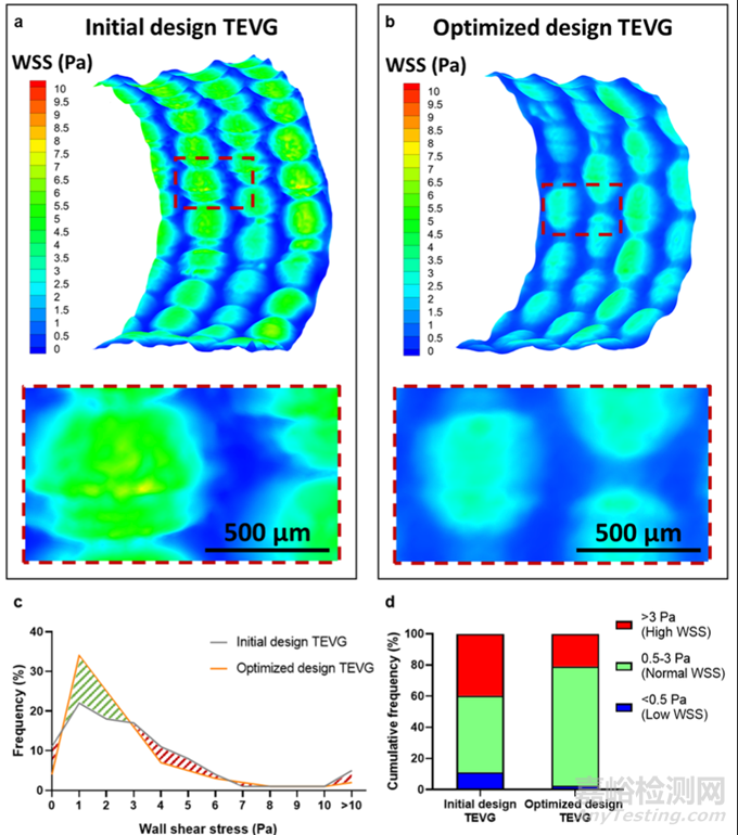 接著研究人員想評(píng)估編織設(shè)計(jì)變化對(duì)WSS的影響。根據(jù)最初編織設(shè)計(jì)(經(jīng)線數(shù):51,緯線尺寸:2×5毫米寬帶,緯線張力:高)和優(yōu)化后編織設(shè)計(jì)(經(jīng)線數(shù):27,緯線尺寸:2×3毫米寬帶,緯線張力:低)TEVG的μCT圖像制作CFD模型,以模擬移植物內(nèi)的血流變化。模型預(yù)測(cè)表明,剪應(yīng)力峰值將產(chǎn)生于波峰,緯線之間波谷中的WSS要低得多。這些模型還表明,優(yōu)化設(shè)計(jì)將產(chǎn)生更低的剪切應(yīng)力峰值和更均勻的WSS。對(duì)WSS值頻率的量化證實(shí)這些觀察結(jié)果,因?yàn)槠滹@示出中間值在優(yōu)化表面上更為常見(jiàn),而極端值則較為罕見(jiàn)。對(duì)低WSS(<0.5 Pa)、正常WSS(0.5-3 Pa)和高WSS(>3 Pa)三個(gè)范圍的WSS值累積頻率進(jìn)行計(jì)算。結(jié)果顯示,采用優(yōu)化設(shè)計(jì)的TEVG在正常WSS范圍內(nèi)頻率較高,在高WSS和低WSS范圍內(nèi)頻率分別降低19%和8%。