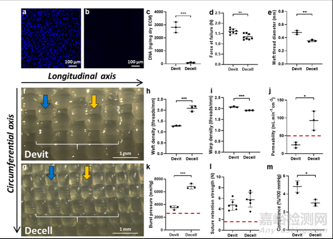 本文所有實(shí)驗(yàn)都是使用"脫細(xì)胞"的CAM進(jìn)行操作。雖然已有數(shù)據(jù)表明異體"脫細(xì)胞"CAM具有良好的耐受性,但研究人員仍進(jìn)行了脫細(xì)胞過(guò)程對(duì)編織TEVG力學(xué)性能的影響研究,促進(jìn)ECM處理方法進(jìn)一步發(fā)展。圖5顯示去活力或脫細(xì)胞CAM片編織的TEVG特性比較。DAPI染色和DNA定量證實(shí)CAM片脫細(xì)胞過(guò)程有效。DNA含量降低97%。單軸拉伸測(cè)試結(jié)果,脫細(xì)胞帶的破壞力(-13%)略低于去活力帶。脫細(xì)胞帶制成的緯線直徑明顯小于去活力帶制成的緯線直徑,與之前結(jié)果一致,使表面波紋顯著減少。與去活力化移植物相比,脫細(xì)胞TEVG的經(jīng)線明顯更寬,緯線密度更低。在TEVG脫細(xì)胞后,緯線密度增加62%,經(jīng)線密度降低10%。脫細(xì)胞移植物的內(nèi)徑也略小(7%),但壁薄得多(35%)。去活力TEVG與脫細(xì)胞TEVG之間最重要的區(qū)別是,脫細(xì)胞TEVG的透壁通透性要高得多(288%)。與去活力TEVG相比,脫細(xì)胞TEVG的爆破壓明顯更高(96%),但縫合保持強(qiáng)度不變。最后,脫細(xì)胞TEVGs的順應(yīng)性明顯降低,與爆破壓增加情況一致。