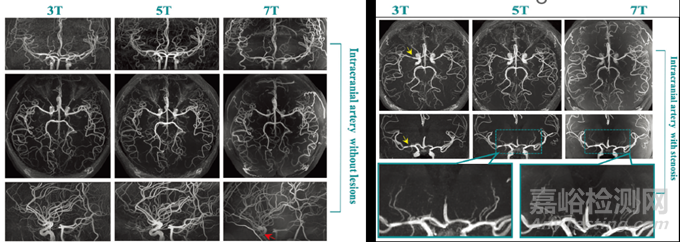 代表性TOF-MRA圖像。注:7-T MRI 掃描顯示頸動(dòng)脈虹吸管中的信號(hào)強(qiáng)度損失(紅色箭頭)。 在左側(cè)大腦中動(dòng)脈的狹窄部位(黃色箭頭),5-T 圖像上的豆紋動(dòng)脈和 7 T 圖像上的豆紋動(dòng)脈均可見。