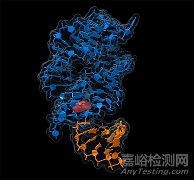 RNA 核糖開關的結構,當它與小分子(紅色)結合時,會改變基因的表達。/圖片來源:Carlos Clarivan/Science Photo Library