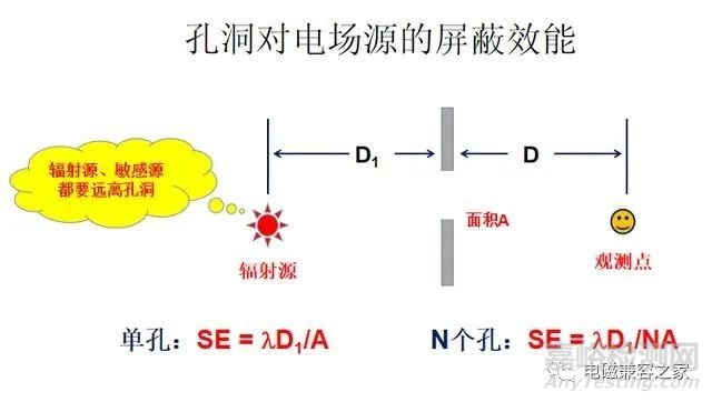 對(duì)于單個(gè)孔洞,圖中給出了一個(gè)簡單的屏蔽效能計(jì)算公式。與屏蔽效能有關(guān)的因素一目了然。