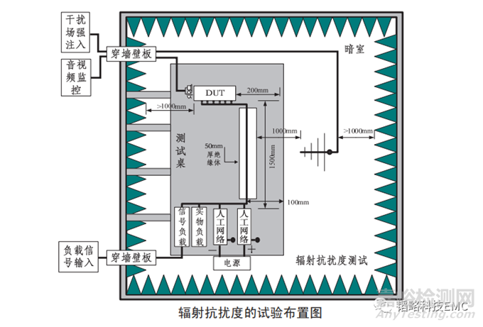 輻射抗擾度測試頻率范圍為400MHz~2000MHz。信號頻率大于1000MHz時, 天線中心應正對DUT中心,分別用水平和垂直方向測試。