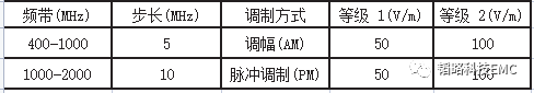 采用調(diào)幅方式(AM)時,調(diào)制頻率為1kHz,調(diào)制等級80%。采用脈沖調(diào)制 方式(PM)時,方波重復頻率為217Hz (士 10%),高電平持續(xù)時間為577Qs。每個頻率點的停留時間不小于2s。測試信號要求如下: