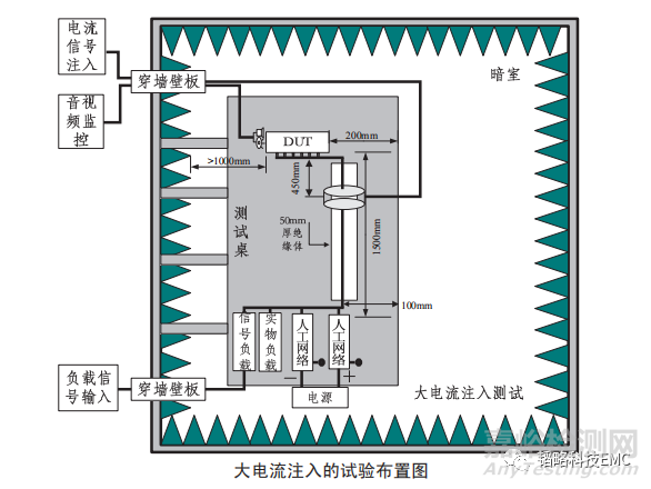 電器部件大電流的測試可參照ISO11452-4標準中的BCI測試方法中的替代法進行測試, 注入鉗距DUT為450mm。對于有CAN線等通信負載的,線束需要夾于電流鉗之內(nèi)。