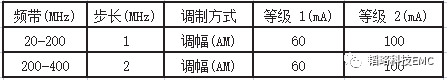 大電流測試頻率范圍為20MHz~400MHz。采用調(diào)幅方式(AM)時,調(diào)制頻率為1kHz, 調(diào)制等級80%。每個頻率點的停留時間不小于2s。