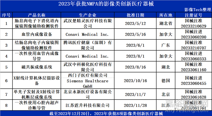 據(jù)國家藥品監(jiān)督管理局(NMPA)官網(wǎng)公示,2023年有8款影像相關(guān)創(chuàng)新醫(yī)療器械獲批上市,包括腸息肉電子下消化道內(nèi)窺鏡圖像輔助檢測軟件、血管內(nèi)成像設(shè)備及一次性導(dǎo)管、結(jié)腸息肉電子內(nèi)窺鏡圖像輔助檢測軟件等,來自楚精靈、Conavi Medical 、騰訊醫(yī)療健康等公司。這8款創(chuàng)新醫(yī)療器械可大致分為三類: