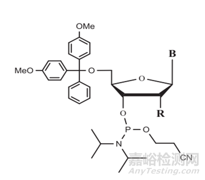 小核酸藥物的關(guān)鍵原料為核苷單體,如圖2所示,DNA的亞磷酰胺單體主要是由堿基、脫氧核糖、5'-DMT和3'端的2-氰乙基以及二異丙胺基組成;而RNA的亞磷酰胺單體在DNA的亞磷酰胺單體的基礎(chǔ)上,需要對(duì)2'-OH進(jìn)行保護(hù),該保護(hù)基團(tuán)一般為T(mén)BDMS(叔丁基二甲基硅基);此外,由于腺嘌呤,鳥(niǎo)嘌呤和胞嘧啶上存在伯胺基,因此也需要一定的基團(tuán)保護(hù),通常用作這些氨基保護(hù)基的是?;绫郊柞;˙z),乙?;ˋc),異丁?;?;然而,對(duì)于該步驟中,最關(guān)鍵的