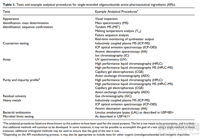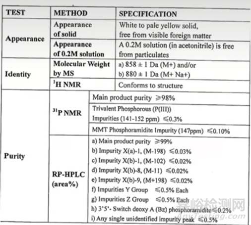 由于小核酸藥物處于早期,目前無(wú)明確的法規(guī)對(duì)其進(jìn)行指導(dǎo),2021年FDA[5]發(fā)布關(guān)于反義寡核苷酸藥物的化學(xué)、生產(chǎn)控制指南中提出;對(duì)于原料藥,F(xiàn)DA推薦采用兩種方法進(jìn)行鑒別,鑒別包括:分子量及序列,其他方法包括熔點(diǎn)(Tm)、液相保留時(shí)間;原料質(zhì)量研究?jī)?nèi)容包括:序列(質(zhì)譜分析)、熔點(diǎn)(Tm)、成鹽形式、殘留溶劑、水分、微生物檢測(cè)、細(xì)菌內(nèi)毒素、雜質(zhì)個(gè)數(shù)、特定雜質(zhì)含量、總雜、元素雜質(zhì)、重金屬等等;
