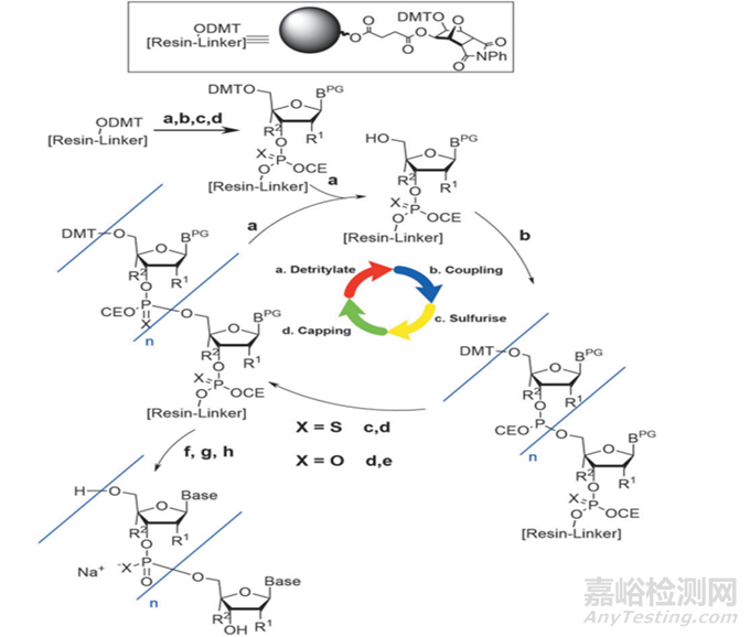 單體合成后,需要進(jìn)行下一步,對(duì)其序列進(jìn)行合成純化,工業(yè)上合成純化方法主要包括:化學(xué)合成法、RNA酶解法、微生物發(fā)酵法及生物催化法,其中化學(xué)合成主要方法又包括反相色譜法(固相合成—反相色譜純化—脫三苯甲基化—乙醇沉淀法等—凍干)、離子交換層析法(固相合成—離子交換層析—濃縮/深層過(guò)濾—凍干)、疏水層析結(jié)合離子交換層析(固相合成—疏水層析—脫三苯甲基化—離子交換—UF/DF—原料藥溶液);目前已上市的核酸藥物大多采用化學(xué)合成法中反向色譜法和離子交換層析法,該方法的具體步驟包括去DMT(脫三苯甲基)保護(hù)、偶聯(lián)、氧化、加帽,循環(huán)(見(jiàn)下圖4)達(dá)到所需要的序列長(zhǎng)度后,再進(jìn)行裂解和脫保護(hù)(Cleavage and Deprotection,C&D),最終得到我們所需要的序列;然而,在這一過(guò)程中,若工藝參數(shù)控制不好很有可能會(huì)產(chǎn)生一系列的雜質(zhì),包括產(chǎn)生N-X序列如N-1,N+X的序列(longmer sequences)如N+G,硫代磷酸酯鍵(PS)產(chǎn)生的非對(duì)映異構(gòu)體和氧化產(chǎn)生PO雜質(zhì),胞嘧啶和5-甲基胞嘧啶脫氨基引起的雜質(zhì),其他雜質(zhì)如堿基脫嘌呤雜質(zhì),2'-5'連接異構(gòu)雜質(zhì),序列異構(gòu)體等。