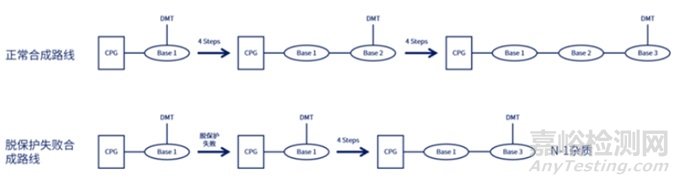 N-X序列(shortmer sequences),如N-1的產(chǎn)生主要原因包括:①脫保護(hù)時(shí)間的長(zhǎng)短,以及脫保護(hù)劑的酸堿性,脫保護(hù)反應(yīng)時(shí)間不夠/脫保護(hù)劑酸性太弱會(huì)產(chǎn)生N-1雜質(zhì);而脫保護(hù)時(shí)間又取決于流速和柱子的尺寸;②空間位阻導(dǎo)致脫保護(hù)劑脫離效率低產(chǎn)生N-1的雜質(zhì);