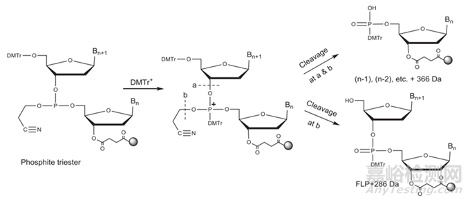 N+X的序列(longmer sequences),如N+G,N+A的產(chǎn)生主要原因包括:①脫保護(hù)試劑沖洗不干凈導(dǎo)致N+1雜質(zhì)的產(chǎn)生;②亞磷酰胺單體自身形成二聚體,然后與5'-OH反應(yīng);③新加入的亞磷酰胺單體被偶聯(lián)兩次;