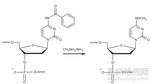 胞嘧啶和5-甲基胞嘧啶脫氨基引起的雜質(zhì):在斷裂和脫保護(hù)過(guò)程中,甲胺與胞苷殘基(被苯甲?;Wo(hù))反應(yīng)形成N-4-甲基胞苷雜質(zhì)。