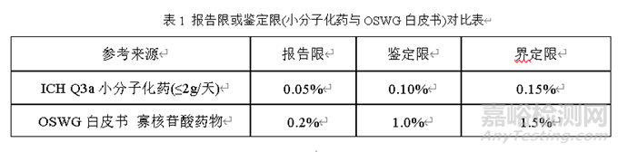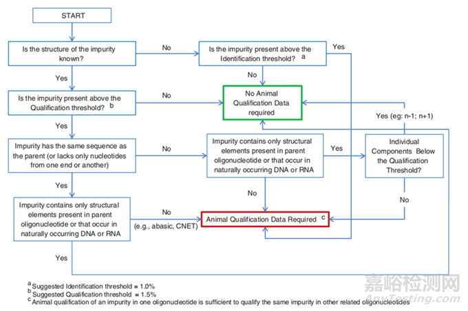 關(guān)于雜質(zhì)限度的制定,暫無(wú)明確的法規(guī)進(jìn)行參考,根據(jù)OSWG白皮書(shū)[6]第10章關(guān)于寡核苷酸藥物中雜質(zhì)中指出,建議鑒定限為1.0%,界定限為1.5%;文章給出制定該標(biāo)準(zhǔn)的理由有三點(diǎn):第一:寡核苷酸藥物的新雜質(zhì)或未知雜質(zhì)的大部分來(lái)源于合成,而這些雜質(zhì)的化學(xué)結(jié)構(gòu)很可能與目標(biāo)化合物相似,它們的化學(xué)性質(zhì)也有可能與目標(biāo)化合物相似,比如水溶性、與蛋白結(jié)合力、分子量等;第二:由于寡核苷酸藥物的分子量與小分子的分子量差異很大,比如,小分子的分子量大概為500Da,而寡核苷酸藥物的分子量可能要達(dá)到5000Da,它們的分子量相差10倍,因此,在相同的臨床劑量下,由于分子量的差異,寡核苷酸的雜質(zhì)水平為1.0%與小分子藥物0.1%的數(shù)量相當(dāng);第三:根據(jù)現(xiàn)有的毒理學(xué)數(shù)據(jù),無(wú)法證明寡核苷酸藥物的毒性是來(lái)源于雜質(zhì)。同時(shí)文章中,還給出了關(guān)于寡核苷酸藥物雜質(zhì)鑒定決策樹(shù)(詳見(jiàn)下圖5);具體報(bào)告限或鑒定限(小分子化藥與OSWG白皮書(shū))對(duì)比表。
