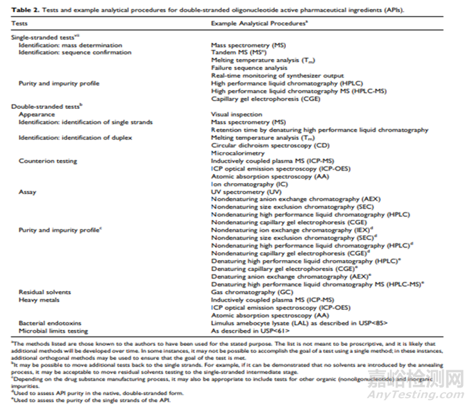 表2 雙鏈寡核苷酸活性成分的檢測(cè)項(xiàng)目和分析方法[7]