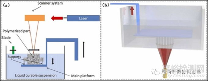 圖1.光固化技術(shù)原理圖 (a)SLA工藝示意圖;(b)DLP過(guò)程示意圖