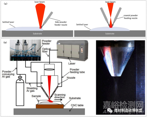 圖3. 送粉直接成型技術(shù)工作原理圖 (a)噴嘴工作位置示意圖;(b)沉積系統(tǒng)和成型示意圖