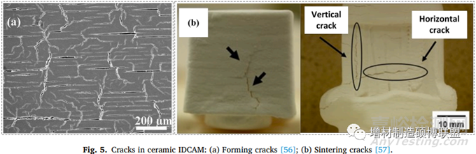 CAM工業(yè)應(yīng)用滯后的主要原因是成形缺陷過(guò)多和成形質(zhì)量差。其中,裂紋缺陷嚴(yán)重影響陶瓷件的力學(xué)性能,是該技術(shù)向工業(yè)實(shí)用化推進(jìn)的最大障礙。目前,現(xiàn)有的CAM裂紋缺陷研究主要集中在實(shí)驗(yàn)方法的裂紋形貌和抑制上。根據(jù)是否需要進(jìn)行后處理,CAM技術(shù)可分為間接陶瓷增材制造(IDCAM)和直接陶瓷增材制造(DCAM)。對(duì)于IDCAM,裂紋缺陷主要是在后續(xù)的高溫脫脂和燒結(jié)過(guò)程中產(chǎn)生的。在高溫脫脂過(guò)程中,生坯發(fā)生劇烈的體積收縮,進(jìn)而在燒結(jié)件表面或內(nèi)部產(chǎn)生裂紋缺陷。對(duì)于DCAM,陶瓷材料在可見光或近紅外光范圍內(nèi)的低熱震性、弱致密化和低光吸收使得該技術(shù)制備氧化物陶瓷仍然極具挑戰(zhàn)性。在陶瓷粉末與高能量密度激光束的強(qiáng)相互作用下,陶瓷粉末在極短時(shí)間內(nèi)經(jīng)歷高溫熔化和冷卻凝固過(guò)程,由此產(chǎn)生的高溫梯度和冷卻速率導(dǎo)致復(fù)雜的相變和微觀結(jié)構(gòu)變化。此外,這個(gè)過(guò)程不可避免地會(huì)產(chǎn)生熱應(yīng)力、收縮應(yīng)力和內(nèi)應(yīng)力。在這些應(yīng)力的耦合作用下形成不均勻的應(yīng)力場(chǎng),容易在樣品表面或內(nèi)部產(chǎn)生不同的微觀和宏觀裂紋缺陷。