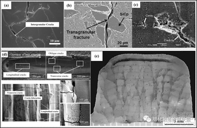 (2) 總結(jié)了不同CAM工藝裂紋的形態(tài)和空間分布特征。IDCAM工藝的裂紋缺陷分為形成裂紋和燒結(jié)裂紋。成型裂紋在坯件內(nèi)呈橫向、橫向分布,而燒結(jié)裂紋則在坯件內(nèi)部或表面雜亂分布。DCAM中的裂紋缺陷主要分為微觀裂紋和宏觀裂紋,裂紋分布呈現(xiàn)出明顯的規(guī)律性。微裂紋集中在晶界和孔隙周圍。鋪粉DCAM的宏觀裂紋主要位于相鄰掃描軌跡的交叉點(diǎn)和沉積層的頂部區(qū)域。送粉DCAM宏觀裂紋的特點(diǎn)是中間裂紋多而密,兩側(cè)長(zhǎng)裂紋,傳播深度大。