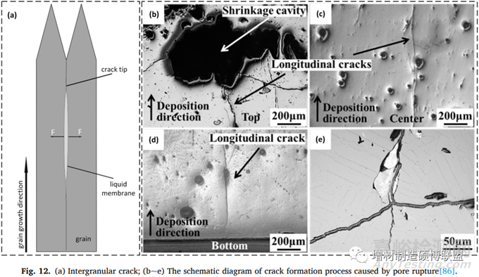 圖8. (a)晶間裂紋; (b)孔隙破裂導(dǎo)致裂紋形成過(guò)程示意圖