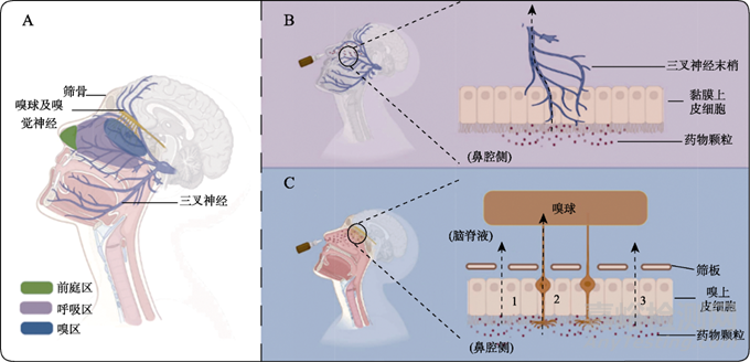A-鼻腔功能分區(qū)和神經(jīng)分布;B-藥物在呼吸區(qū)入腦主要途徑;C-藥物在嗅區(qū)入腦主要途徑。