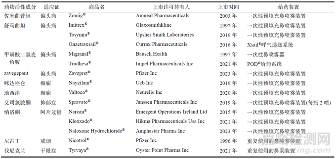 根據(jù)美國(guó)食品藥品監(jiān)督管理局(Food and Drug Administration,F(xiàn)DA)藥物注冊(cè)數(shù)據(jù)及文獻(xiàn)資料,F(xiàn)DA目前批準(zhǔn)了約15個(gè)鼻腦遞送通路的鼻腔給藥制劑,其適應(yīng)證主要集中于偏頭痛、抑郁癥、癲癇、阿片過(guò)量、干眼癥等,鼻用制劑批準(zhǔn)情況見表1。