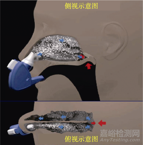 為了充分利用鼻腦遞送優(yōu)勢(shì),使更多的有效成分快速入腦或進(jìn)入上述遞送通路靶點(diǎn),在開發(fā)有關(guān)藥物產(chǎn)品時(shí),應(yīng)盡可能將藥物遞送至上鼻腔(包含了圖1A中嗅覺區(qū)域和呼吸區(qū)上部的部分區(qū)域,即嗅區(qū)和上呼吸區(qū))。因此,能將藥物靶向遞送至上鼻腔的特殊給藥裝置在鼻腦遞送中起到關(guān)鍵作用。
