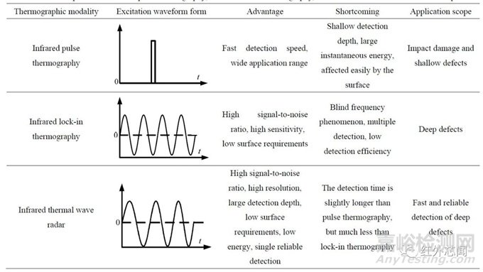 表1 紅外脈沖熱成像、紅外鎖相熱成像以及紅外熱波雷達(dá)成像檢測(cè)技術(shù)的對(duì)比