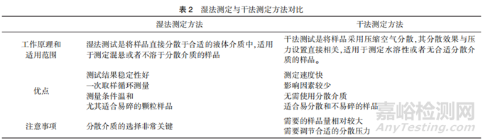 激光衍射法的工作原理是單色光束照射到顆粒后發(fā)生衍射現(xiàn)象,由于衍射光的能量分布與顆粒的大小有關(guān),通過測定衍射光的能量分布,根據(jù)米氏散射理論和弗朗霍夫近似理論,可計算出顆粒的粒度分布。根據(jù)分散介質(zhì)的不同,激光衍射法可分為濕法測定(分散介質(zhì)為液體)和干法測定(分散介質(zhì)為氣體)。濕法測定用于測定混懸供試品或不溶于分散介質(zhì)的供試品,干法測定用于測定水溶性或無合適分散介質(zhì)的固態(tài)供試品[14]。濕法測定的粒度范圍寬、測試結(jié)果穩(wěn)定,是更常用的測定方法。但對于容易溶解于分散劑中的顆粒來說,干法通常為唯一選擇,且干法測定速度更快。濕法和干法測定的優(yōu)勢對比情況詳見表2。