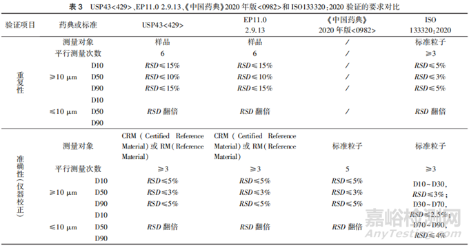 USP43<429>、EP11.0 2.9.13、《中國藥典》2020年版<0982>第三法(光散射法)以及ISO133320對分析方法驗證內(nèi)容的具體要求可參見表3。從表中可以看出,USP和EP關(guān)于粒度分布方法學(xué)驗證部分的要求基本相同,明確了精密度中重復(fù)性的驗證要求,尚未對中間精密度和耐用性的驗證要求進行規(guī)定。
