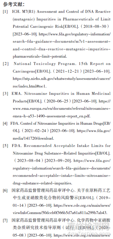 FDA于2020年9月發(fā)布《人用藥物中亞硝胺雜質(zhì)的控制》行業(yè)指南,闡述了亞硝胺雜質(zhì)的可能引入條件,并建議原料藥和制劑生產(chǎn)商對(duì)已批準(zhǔn)或上市銷售的產(chǎn)品以及在審產(chǎn)品進(jìn)行風(fēng)險(xiǎn)評(píng)估,采取適當(dāng)措施減少或防止亞硝胺雜質(zhì)產(chǎn)生[4]。