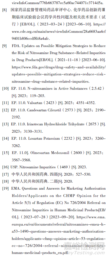 目前,《中華人民共和國(guó)藥典》(Chinese Pharmacopeia,ChP)2020年版增加了《遺傳毒性雜質(zhì)控制指導(dǎo)原則》[17],并且6個(gè)沙坦類品種(纈沙坦、替米沙坦、氯沙坦鉀、厄貝沙坦、坎地沙坦酯及阿利沙坦酯)原料藥標(biāo)準(zhǔn)增訂【生產(chǎn)要求】項(xiàng)[18],規(guī)定應(yīng)對(duì)生產(chǎn)工藝等進(jìn)行評(píng)估以確定形成遺傳毒性雜質(zhì)NDMA、NDEA等的可能性,必要時(shí),應(yīng)采用適宜的分析方法對(duì)產(chǎn)品進(jìn)行分析,以確認(rèn)NDMA、NDEA等的含量符合我國(guó)藥品監(jiān)管部門相關(guān)指導(dǎo)原則或ICH M7指導(dǎo)原則要求。《化學(xué)藥物中亞硝胺類雜質(zhì)研究技術(shù)指導(dǎo)原則(試行)》規(guī)定亞硝胺類雜質(zhì)的分析測(cè)試方法,可以參考權(quán)威機(jī)構(gòu)發(fā)布的方法,亦可自行開(kāi)發(fā)方法,均需注意分析方法靈敏度應(yīng)與所論證的雜質(zhì)限度相匹配,并采用雜質(zhì)對(duì)照品進(jìn)行完整的方法學(xué)驗(yàn)證,保證亞硝胺類雜質(zhì)能夠準(zhǔn)確有效地檢出。若采用自行開(kāi)發(fā)方法,需證明該方法等效于或者更優(yōu)于同品種官方公布的方法。