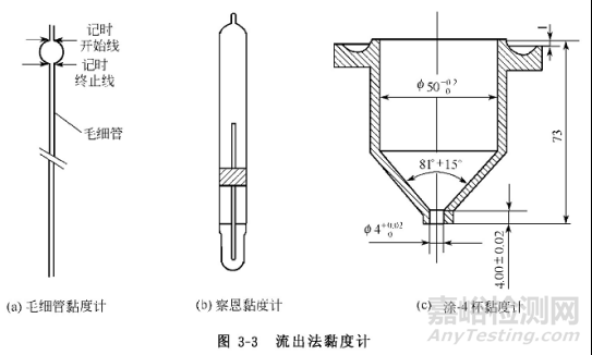 通過測(cè)定液體涂料在一定容積的容器內(nèi)流出的時(shí)間來表示涂料的黏度。依據(jù)使用的儀器可分為毛細(xì)管法和流量杯法(見圖3-3)。這是比較常用的方法。