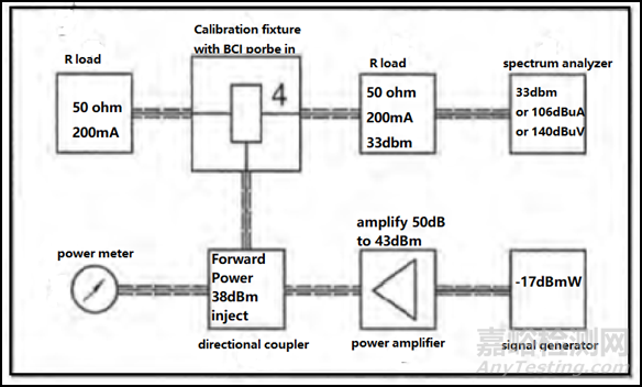 BCI的基本原理是通過電流互感器對設(shè)備的線纜進行耦合注入,產(chǎn)生的共模電流沿著線纜進入設(shè)備內(nèi)部,模擬了電磁環(huán)境的射頻能量干擾的注入。BCI一般使用替代法進行,注入到電流注入鉗的功率是通過100?系統(tǒng)內(nèi)校準(zhǔn)得到的確定的功率,可以參考以下的框圖。