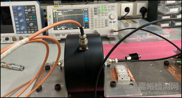 圖上閉口的注入電流鉗內(nèi)徑90mm,采用帶跟蹤源的頻譜儀和夾具插損測量,結(jié)果顯示閉口注入鉗的耦合帶寬和平坦度以及耦合效率高于開口注入鉗。通過使用閉口注入鉗能夠大大降低低功放的最大功率要求。