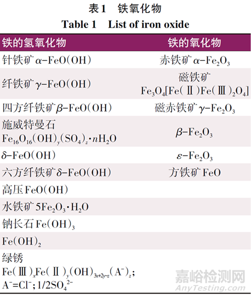 鐵銹是一種復雜的鐵基化合物,常見鋼材銹層可以按照表面結構分為內外兩層:內層為結合緊密、活性較強的牢銹層,是鋼材持續(xù)腐蝕的主要原因;表層結構為疏松多孔的含水浮銹層,結構較為穩(wěn)定,但由于結構疏松多孔,不能抑制銹蝕向內部的發(fā)展。根據(jù)穆斯堡爾譜和X射線衍射(XRD)的研究數(shù)據(jù),依據(jù)不同的晶體結構、化學成分和鐵價態(tài),學者們將氧化鐵分成16 種晶型,如表1 所示。Usmen 等指出,在地表和室溫下,鐵銹主要以Fe(III)氧化物的形式存在,而在海洋大氣附近,一部分Fe(III)會與Fe(II)或其他還原劑反應生成混合價鐵礦物。Kamimura等的XRD研究表明,低碳鋼(暴露15 a)和耐候鋼(暴露32 a)上形成的鐵銹由晶態(tài)α-FeO(OH)、γ-FeO(OH)和非晶態(tài)(非晶相>總鐵銹的50%)組成。Collazo等對比了大氣中和富含氯化物的環(huán)境(暴露于鹽霧室的低碳鋼)中銹蝕晶相和成分的差別,其中大氣中主要腐蝕產物為γ-FeO(OH)、α-FeO(OH),在富含氯化物的環(huán)境中還出現(xiàn)少量活性較強的akaganeite[β-FeO(OH)]和尖晶石相(γ-Fe2O3/Fe3O4)。Cates指出鐵銹中的主要晶體成分是γ-FeO(OH)。Kanevskaya等指出鋼的基本腐蝕產物是γ-FeO(OH),在較高的大氣暴露條件下,還形成了少量Fe3O4。Gancedo等的研究表明,鐵銹中同時存在α -FeO(OH)和γ-FeO(OH),后者最突出。Tripathi等已經(jīng)查明,最初形成的鐵銹含有大量γ-FeO(OH),并隨著時間的推移轉化為非化學計量的Fe3O4。Yahya等的報告中也提到鐵銹主要成分是γ-FeO(OH)和Fe3O4。