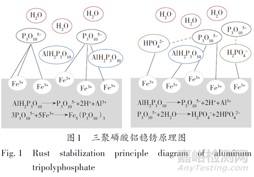 目前最常用的穩(wěn)定型成膜助劑為三聚磷酸鋁,三聚磷酸鋁是鋁離子和磷酸根離子形成的配位化合物,其分子中含有3個O=P鍵,2個HO—P鍵,其活性點的密度遠大于其他磷酸鹽,所以具有比磷酸鹽更強的螯合力和更強的鐵離子捕獲能力,除銹效率更高。三聚磷酸鋁的防銹機理為:首先三聚磷酸鋁的水解能夠解離出三聚磷酸根離子,其能與鐵形成較為穩(wěn)定的螯合物;三聚磷酸根離子進一步水解形成的正磷酸根離子,與鐵離子具有較強的結合效果(圖1)。Song等將三聚磷酸鋁與丙烯酸樹脂和環(huán)氧樹脂復合,用于低碳鋼表面的防腐,顯示出良好的防腐效果,Sorensen等將三聚磷酸鋁與滑石和其他材料混合,以制備丙烯酸涂層,用于管道和鋼板的長效防腐。孔華英將三聚磷酸鋁與聚甲基丙烯酸甲酯微球結合,與環(huán)氧樹脂形成了一種優(yōu)異的防腐顏料,涂層表現(xiàn)出良好的耐腐蝕性。