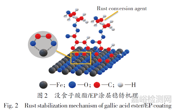 沒食子酸是人類最早發(fā)現(xiàn)的有機酸之一,由多個酚羥基和羧基構成,具有結構簡單,原料易得,性質穩(wěn)定,酸性較弱的特點。Lei等發(fā)現(xiàn)沒食子酸與2,3-丁二醇反應生成的沒食子酸酯具有良好的除銹性能。沒食子酸酯含有帶柔性長鏈的酚羥基,可以滲入銹層,與Fe2+和Fe3+螯合,并形成Fe—O—C結構的絡合物(圖2),不僅包裹了銹物質,還牢固地結合了鐵離子。正是由于這個原因,環(huán)氧樹脂銹蝕涂層的附著力和耐腐蝕性顯著提高。Feng等研究了沒食子酸的改性方法,將羥亞氨基接枝到3,4,5-三羥基苯甲酸(沒食子酸)中,得到一種新型防銹劑——3,4,5-三羥基−2-([ 羥亞氨基)甲基]苯甲酸,鹽霧等測試結果表明,其具有良好的耐腐蝕性,能夠在基材表面形成一層較為致密的鈍化膜,阻止水分子和氯離子等的透。Jia等通過甲基丙烯酸縮水甘油酯與天然沒食子酸的開環(huán)反應合成了可聚合乳液,并探究了其對鐵銹轉化的機理;拉曼光譜、XPS,SEM等研究表明,加入4%沒食子酸改性物質的涂層具有最好的銹蝕轉化能力,能夠將基材表面多孔鐵銹轉化為較為穩(wěn)定的層狀堆疊的α-FeO(OH)相和Fe3O4相,防止了腐蝕介質從表面擴散到金屬基體,提高了耐腐蝕性。