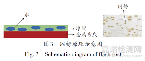 閃銹是低表面處理涂料應用中最常遇到的問題之一。閃銹是由于水性涂料中的水性組分與金屬表面接觸,從而在涂料未完全干燥之前產生的點狀銹蝕現(xiàn)象,如圖3所示,金屬底材產生閃銹的快慢速度為:鑄鐵>碳鋼>鍍鋅板(打磨)>馬口鐵(打磨)。