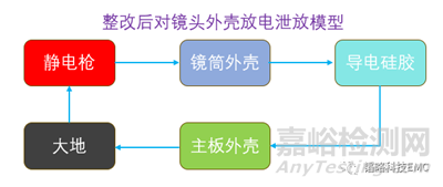 清楚放電模型后,整改思路也開始逐漸清晰,需要將目前現(xiàn)在的鏡筒放電模型往主機外殼放電方向模型去整改。而整改手段最簡單也最直接就是將鏡筒外殼的地和主機外殼的地連接,從而讓鏡筒和主機外殼阻抗導通,用導電布進行連接后,再對鏡筒外殼進行接觸放電±6KV、±8KV均無問題出現(xiàn),結果是可以通過試驗。但是導電布并不能作為實際產(chǎn)品生產(chǎn)的手段,我們需要一個可靠的可量產(chǎn)的整改手段,因為我們整改手段是接地,那我們最主要要注意的是接地點的阻抗差異,如果接地不良會導致阻抗存在阻抗差,并不能到實際理想狀態(tài),所以我們選擇用SMT導電硅橡膠,該產(chǎn)品具有良好的接地阻抗且可以貼片以及對比常規(guī)的導電泡棉壽命更長。整改后的靜電泄放模型如下圖所示: