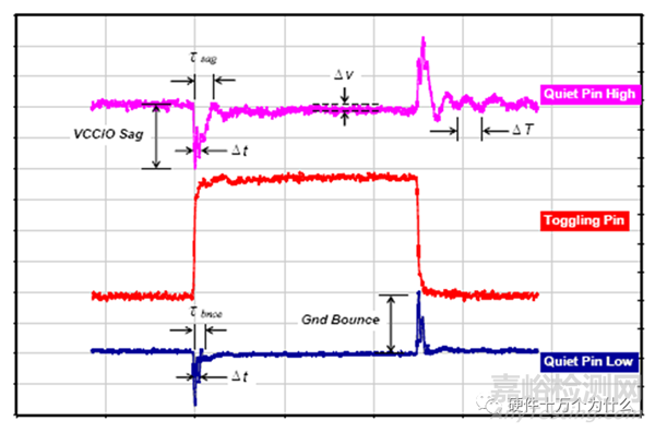 當(dāng)控制信號是一個低電平的時(shí)候,上面PMOS打開,此時(shí)輸出是高電平。打開的瞬間,VCC通過LVCC和R,對芯片B的輸入管腳進(jìn)行充電。當(dāng)控制信號是一個高電平的時(shí)候,下面的NMOS打開,此時(shí)輸出的是低電平。打開的瞬間,芯片B的輸入管腳儲存的電量經(jīng)過NMOS進(jìn)行放電。在CMOS反相器輸出狀態(tài)發(fā)生變化的時(shí)候,流過的電流正是變化的電流。于是,在走線、過孔、平面層和封裝(鍵合引線、引腳)等這些具有電感的鏈接部件上,便會感應(yīng)出電壓。例如標(biāo)準(zhǔn)的GND地電位應(yīng)該是0V,但是芯片與地之間的鏈接部件存在電感,就會感應(yīng)出電壓VGND,那么芯片上的“地”電位就被抬高了,高于0V。如圖13.2所示,當(dāng)CMOS輸出信號同時(shí)從低電平到高電平切換時(shí),VCC上會觀測到一個負(fù)電壓的噪聲,同時(shí)也會影響到GND,并有可能引起一個振蕩。當(dāng)輸出信號從高電平到低電平切換時(shí),GND上會觀測到一個正電壓的噪聲,同時(shí)也會影響到VCC,并有可能引起一個振蕩。