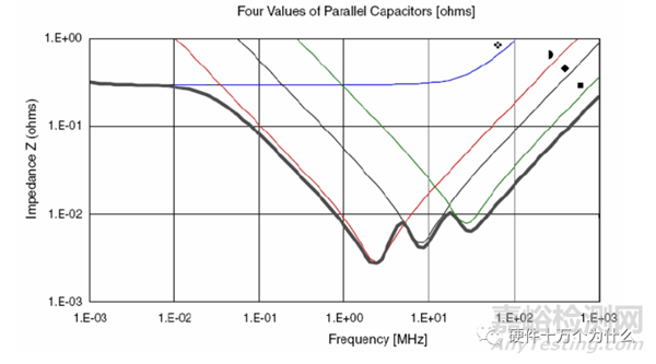 用一個電容組合的例子。這個組合使用的電容為:2個680uf鉭電容,7個2.2uf陶瓷電容(0805封裝),13個0.22uf陶瓷電容(0603封裝),26個0.022uf陶瓷電容(0402)。圖中上部平坦的曲線是680uf電容的阻抗曲線,其它三個容值的曲線為為圖中三個V字曲線,從左到右2.2uf →0.22uf→ 0.022uf。總的阻抗曲線為底部粗包路線。