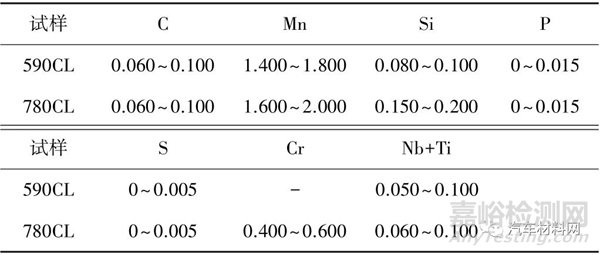 試驗材料為某鋼廠生產(chǎn)的車輪用鋼590CL 和780CL,主要化學(xué)成分(質(zhì)量分?jǐn)?shù))如表1。