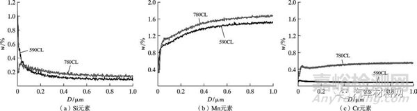 采用GDS 850A 型輝光光譜儀(GDS)對酸洗后的590CL 和780CL 鋼板元素隨深度分布情況進(jìn)行表征,采用電壓700 V,電流20 mA。