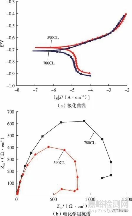 電化學(xué)測試使用的是PARSTAT 2273 電化學(xué)工作站,測試溶液為3.5%NaCl 溶液,使用三電極體系進(jìn)行試驗:參比電極為飽和氯化銀電極(Ag/AgCl),輔助電極為鉑電極,車輪用鋼590CL 和780CL 分別為工作電極。極化曲線試驗前把試樣浸泡10 min,掃描電位為-0.25~0.25 V(vs OCP),掃描速率為1 mV/s。電化學(xué)阻抗的測量振幅為10 mV,頻率范圍1.0×(10-2 ~105) Hz,測量后用ZSimp-win 軟件對其數(shù)據(jù)進(jìn)行擬合。