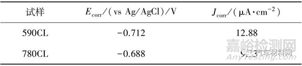 (3)電化學(xué)試驗結(jié)果表明,780CL 的耐腐蝕性能優(yōu)于590CL,電化學(xué)結(jié)果與中性鹽霧試驗及腐蝕速率結(jié)果保持一致。