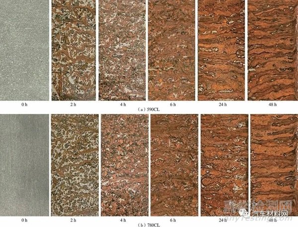 Fig.4 Macroscopic images of two typical wheel steel sheets after neutral salt spray test for different time