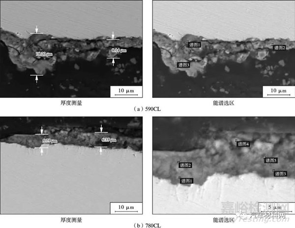 圖7 為試樣經(jīng)中性鹽霧試驗48 h 后的截面微觀形貌。590CL 截面銹層疏松且存在較多裂紋,厚度在8.14~18.20 μm 之間,對基體的保護(hù)作用較差;780CL截面銹層內(nèi)層與基體結(jié)合較為致密,保護(hù)作用較好,外層較為疏松,厚度在5.75~6.35 μm 之間。截面EDS 能譜結(jié)果如表4。